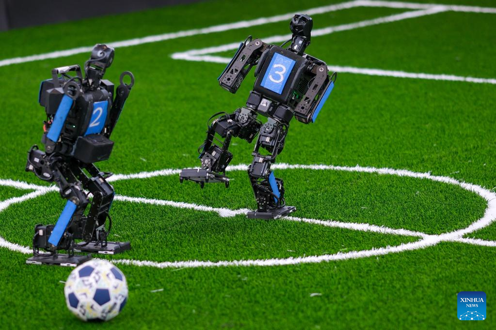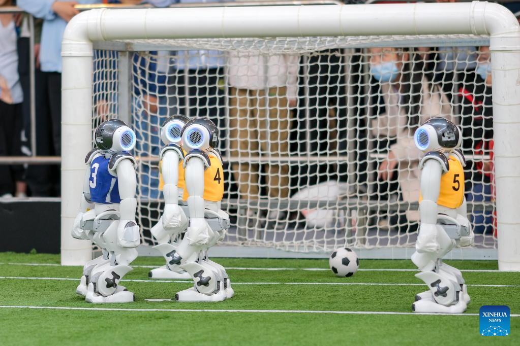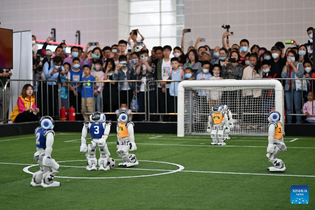 This photo taken on May 20, 2023 shows robots competing in a football game during the seventh World Intelligence Congress (WIC) in north China's Tianjin. The WIC, a major artificial intelligence (AI) event in China, kicked off here on Thursday. (Xinhua/Zhang Cheng)