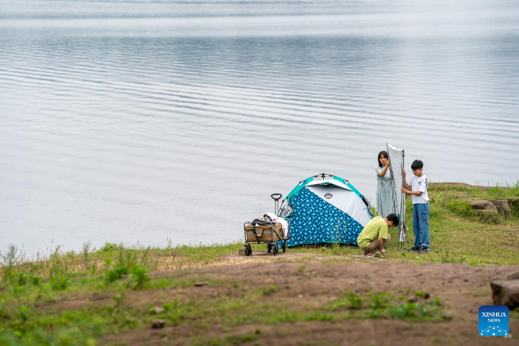 Utilizing its ecological advantages, tourism facilities such as a lakeside sports park, a cycling track around the lake, a camping and fishing area, and a water sports base have been built here, prospering the local economy. (Xinhua/Tang Yi)