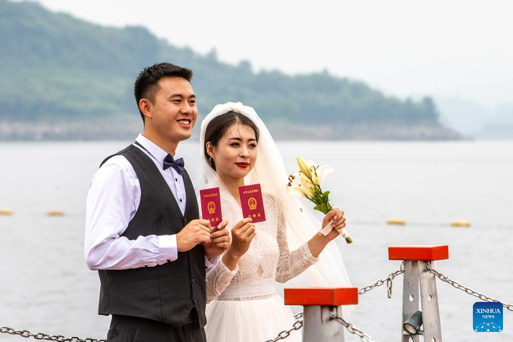 A couple has their wedding at the Changshou Lake scenic area in Changshou District of southwest China's Chongqing, May 20, 2023. Located in Changshou District of southwest China's Chongqing, Changshou Lake is the largest artificial lake in southwest China, and is rich in natural resources.