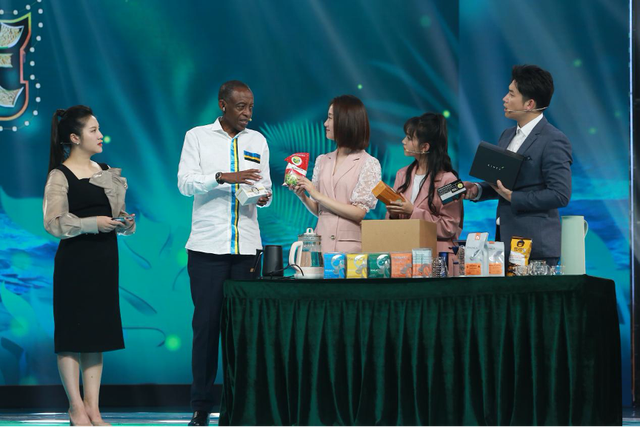 Rwandan Ambassador to China James Kimonyo recommends a tea drink from Rwanda to Chinese consumers via livestreaming. (Photo from Hainan Television)