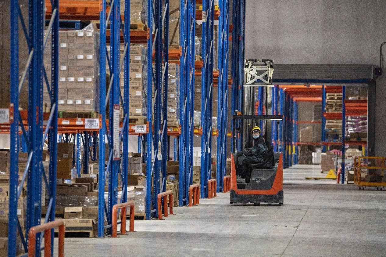 A worker sorts commodities in a warehouse of e-commerce giant JD.com in Jinhua, east China's Zhejiang province. (Photo by Hu Xiaofei/People's Daily Online)