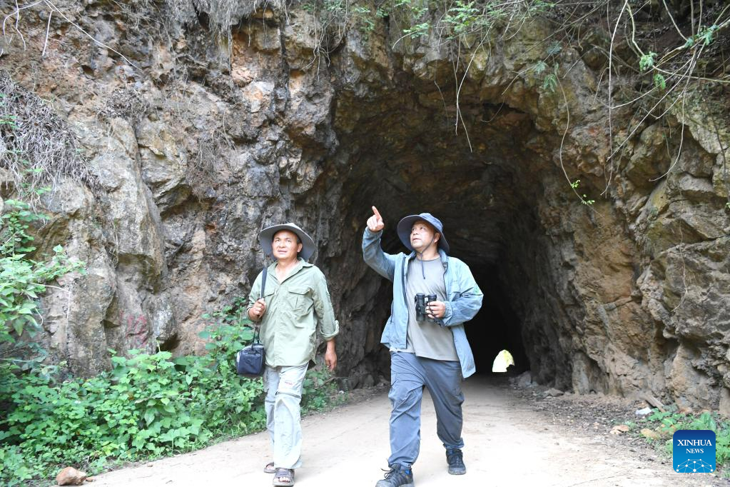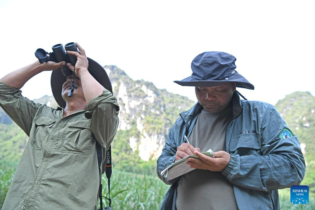 Meng Yuning (R) and his colleague record the living situation of white-headed langurs at the Bapen Nature Reserve in Fusui County, southwest China's Guangxi Zhuang Autonomous Region, May 18, 2023. (Xinhua/Zhou Hua)