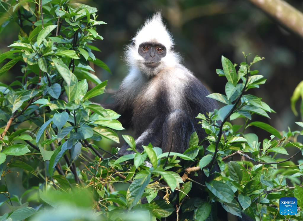 A white-headed langur is pictured at the Bapen Nature Reserve in Fusui County, southwest China's Guangxi Zhuang Autonomous Region, May 18, 2023. (Xinhua/Zhou Hua)