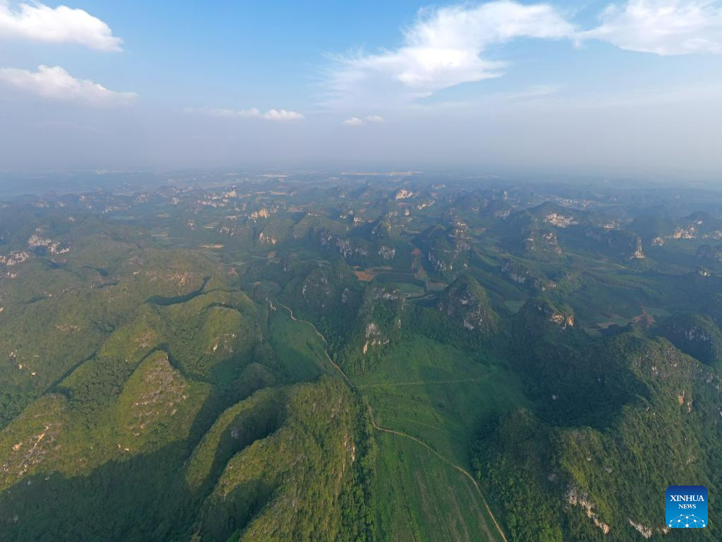 This aerial photo shows the Bapen Nature Reserve in Fusui County, southwest China's Guangxi Zhuang Autonomous Region, May 18, 2023. (Xinhua/Zhou Hua)