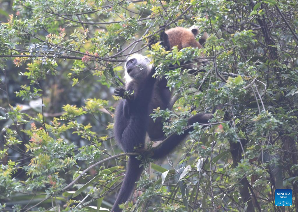 White-headed langurs are pictured at the Bapen Nature Reserve in Fusui County, southwest China's Guangxi Zhuang Autonomous Region, May 18, 2023. (Xinhua/Zhou Hua)