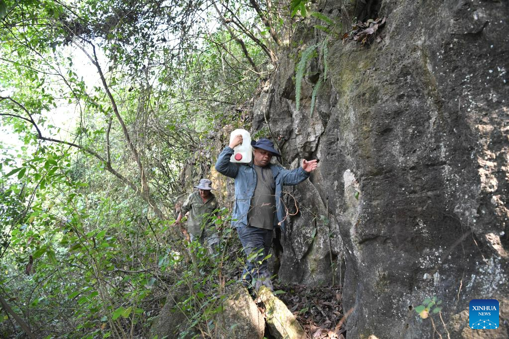 Meng Yuning (front) and his colleague transport water for white-headed langurs at the Bapen Nature Reserve in Fusui County, southwest China's Guangxi Zhuang Autonomous Region, May 18, 2023. (Xinhua/Zhou Hua)