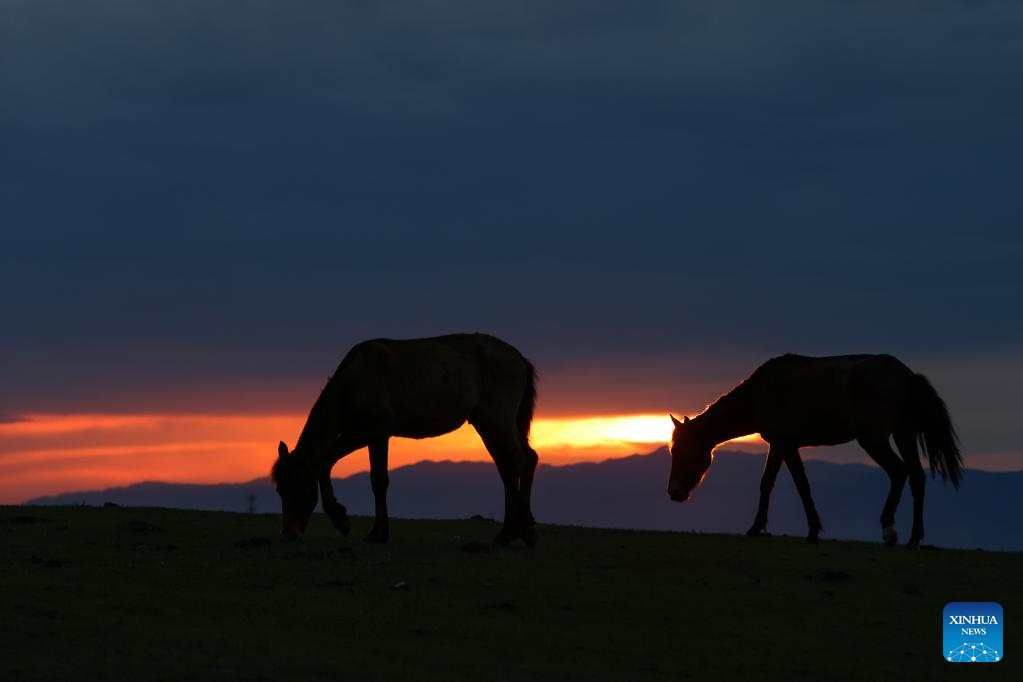 Horses graze on the Narat grassland in Xinyuan County of northwest China's Xinjiang Uygur Autonomous Region May 20, 2023. The grassland scenic spot has witnessed more than 87,000 tourist trips in May. (Xinhua/Hao Zhao)