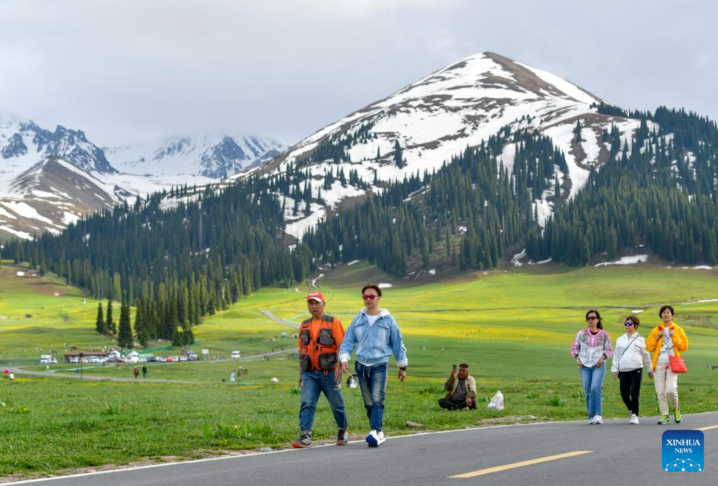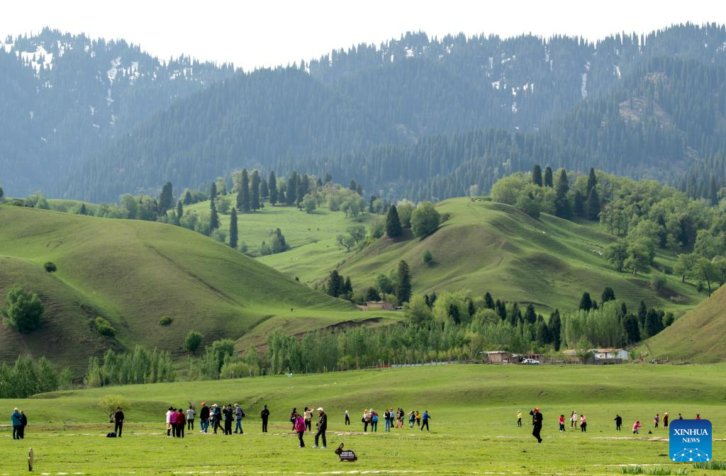 Visitors are seen at the Narat scenic spot in Xinyuan County of northwest China's Xinjiang Uygur Autonomous Region May 19, 2023. The grassland scenic spot has witnessed more than 87,000 tourist trips in May. (Xinhua/Wang Fei)