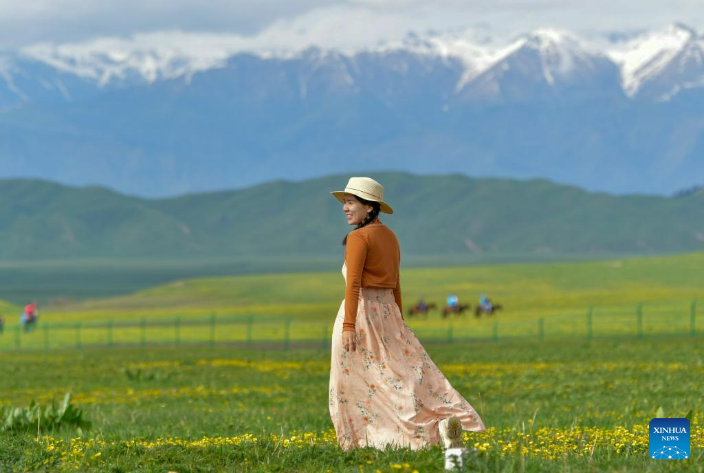 A visitor is seen at the Narat scenic spot in Xinyuan County of northwest China's Xinjiang Uygur Autonomous Region, May 19, 2023. The grassland scenic spot has witnessed more than 87,000 tourist trips in May. (Xinhua/Wang Fei)