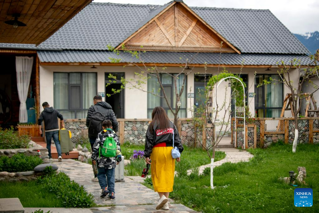 Visitors check in at a homestay in Narat Town in Xinyuan County of northwest China's Xinjiang Uygur Autonomous Region May 20, 2023. The grassland scenic spot has witnessed more than 87,000 tourist trips in May. (Xinhua/Wang Fei)
