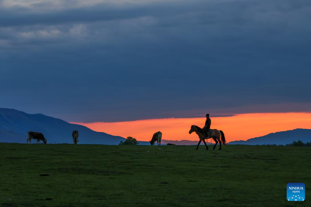 A herdsman rides a horse on the Narat grassland in Xinyuan County of northwest China's Xinjiang Uygur Autonomous Region May 20, 2023. The grassland scenic spot has witnessed more than 87,000 tourist trips in May. (Xinhua/Hao Zhao)