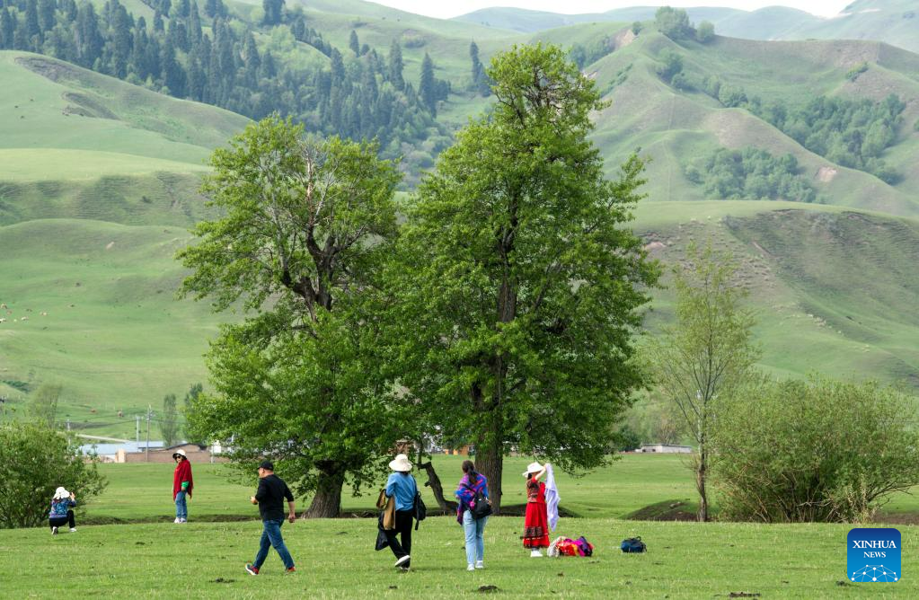 Visitors are seen at the Narat scenic spot in Xinyuan County of northwest China's Xinjiang Uygur Autonomous Region May 20, 2023. The grassland scenic spot has witnessed more than 87,000 tourist trips in May. (Xinhua/Wang Fei)