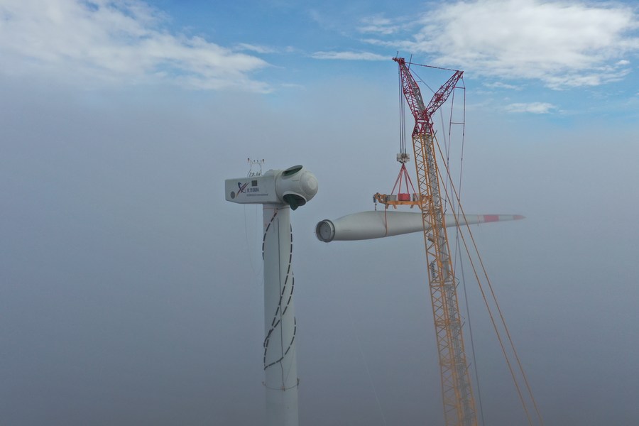 A wind turbine blade is installed at the construction site of the Senj Wind Farm in Senj, Croatia, Sept. 27, 2020. (Photo by Ding Decai/Xinhua)