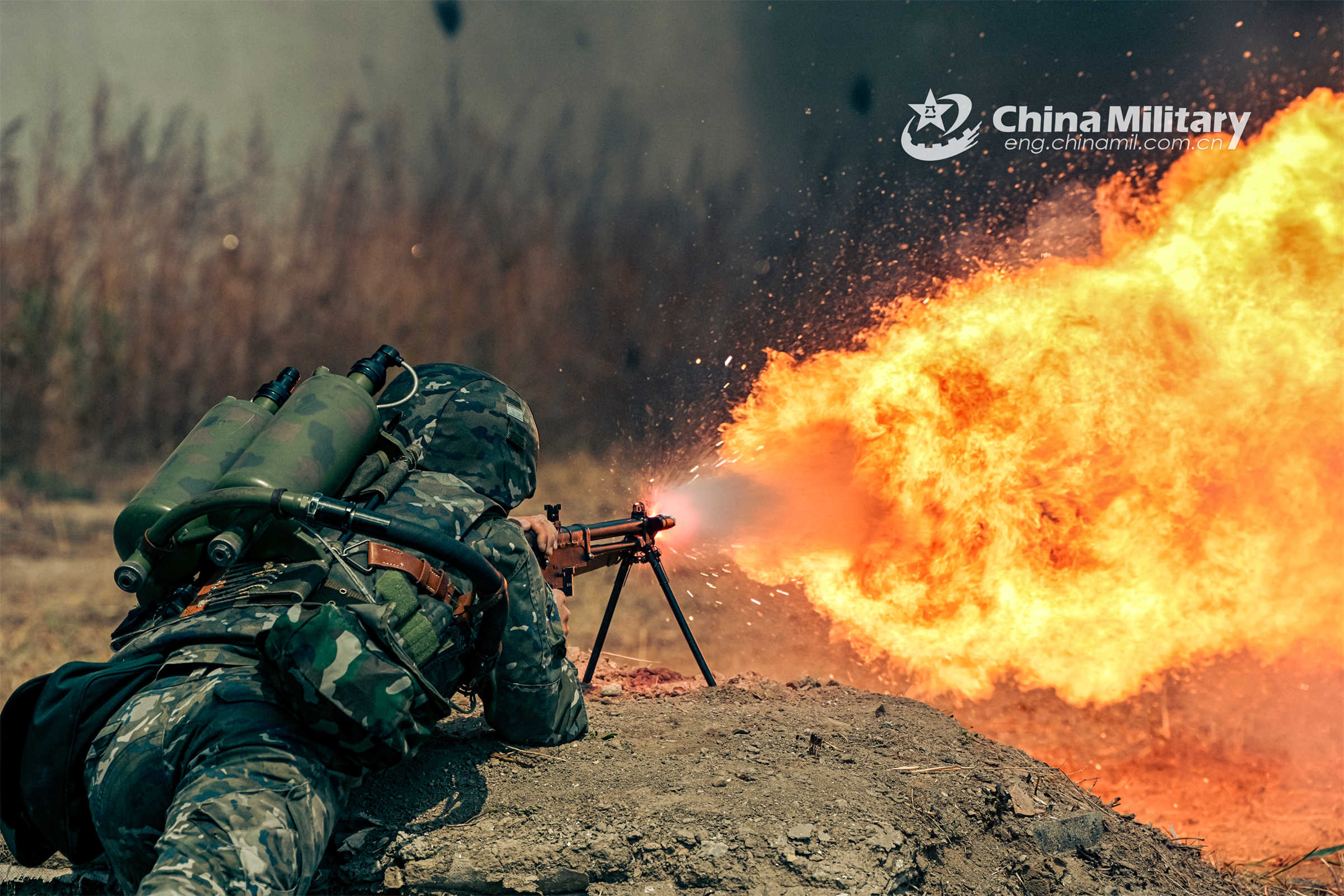 A flamethrower operator ignites a controlled fire to burn down the simulated target during a recent attacking drill. He is assigned to a chemical-defense element with a mobile detachment under the Chinese People's Armed Police (PAP) Force Tianjin Corps. (eng.chinamil.com.cn/photo by Wang Liang)