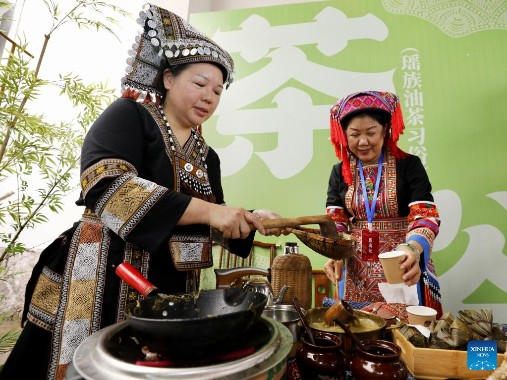 Staff display oil tea custom of Yao people during a tea culture event held in Fuzhou, southeast China's Fujian Province, May 21, 2023. May 21 marks the International Tea Day. (Xinhua/Jiang Kehong)