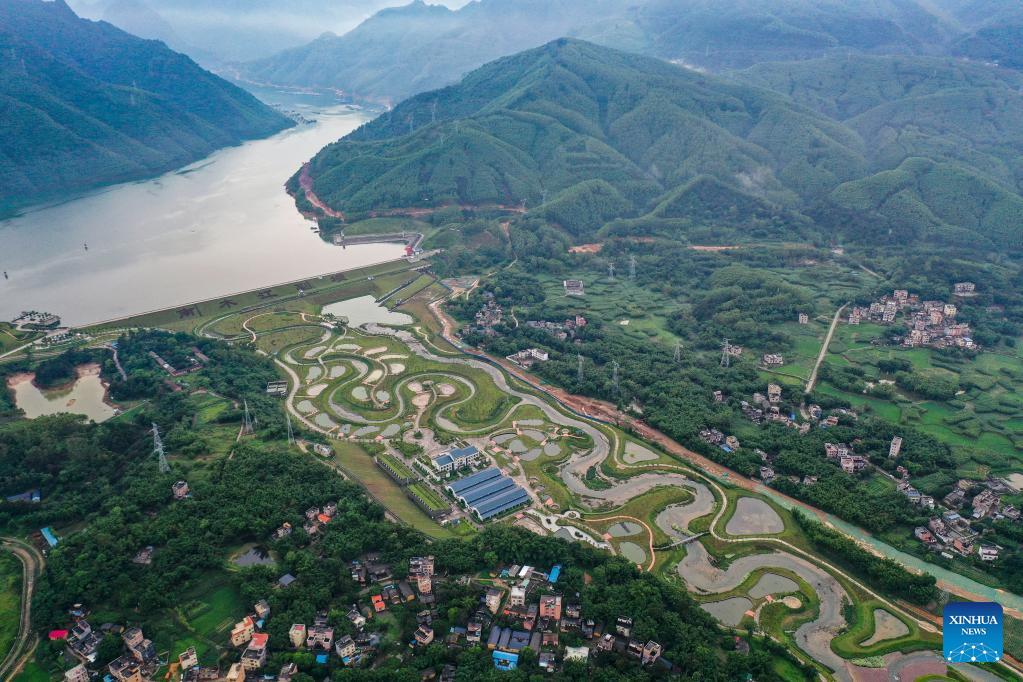 This aerial photo shows the nature-imitated fishway of the auxiliary dam in Nanmu River, which is part of the Dateng Gorge water conservancy project in Guiping City, south China's Guangxi Zhuang Autonomous Region, May 20, 2023. (Xinhua/Cao Yiming)