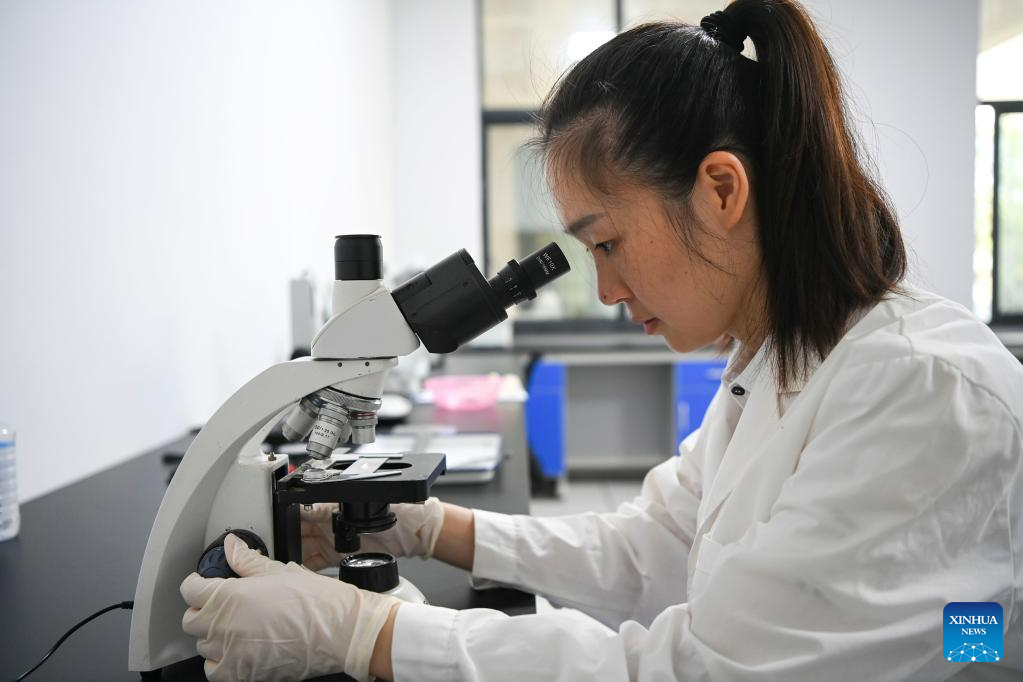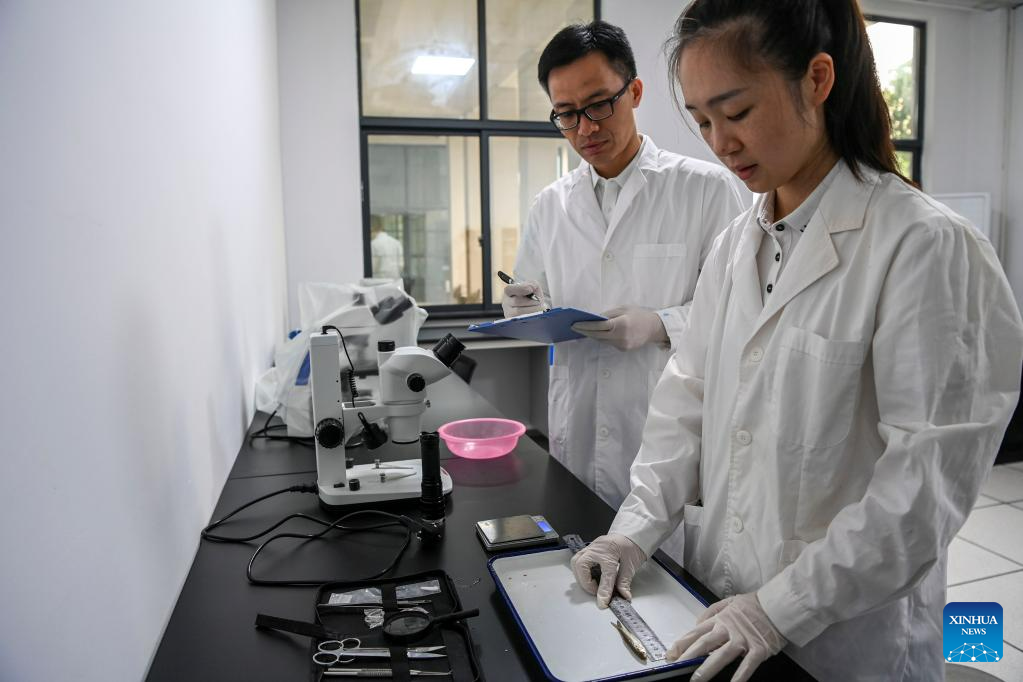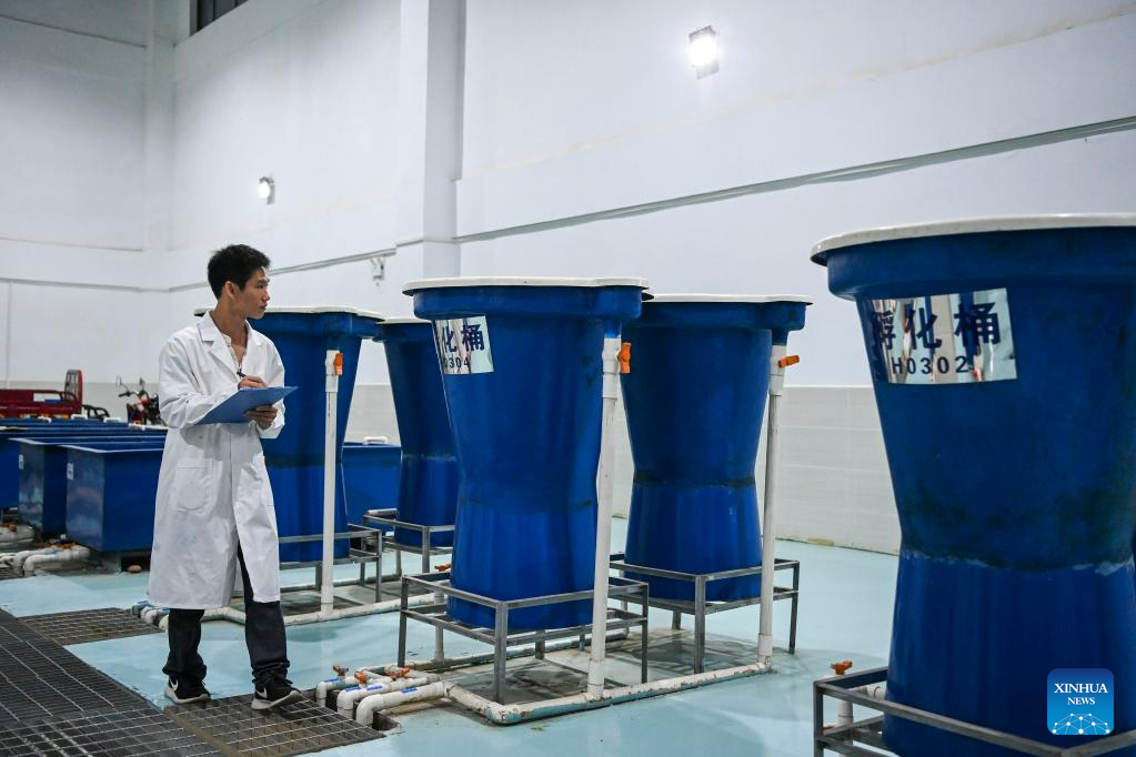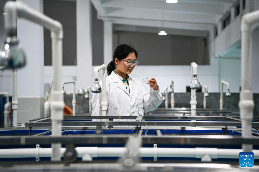 A researcher works at a rare fish conservation center of the Dateng Gorge water conservancy project in Guiping City, south China's Guangxi Zhuang Autonomous Region, May 20, 2023. (Xinhua/Cao Yiming)