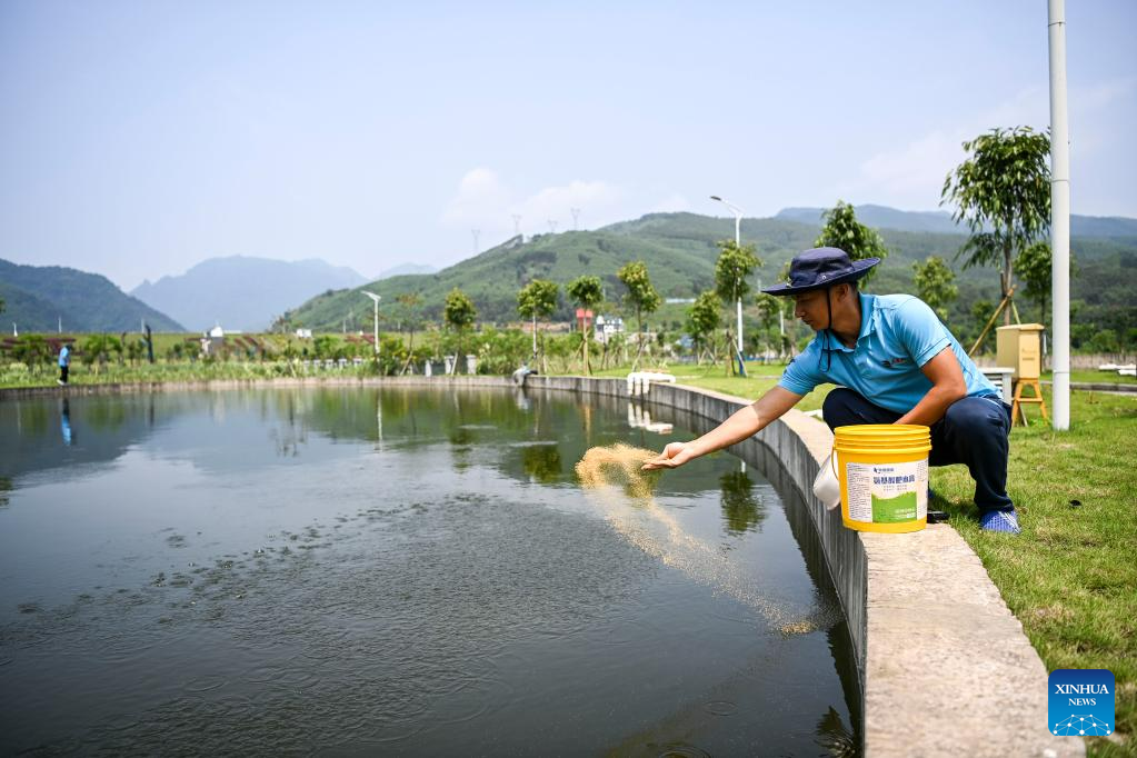 A technician sprays fish feed at a fish propagation station of the Dateng Gorge water conservancy project in Guiping City, south China's Guangxi Zhuang Autonomous Region, May 20, 2023. (Xinhua/Cao Yiming)