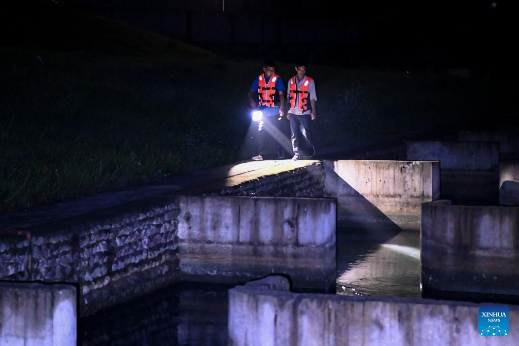 Technicians conduct night monitor of the nature-imitated fishway of the auxiliary dam in Nanmu River, which is part of the Dateng Gorge water conservancy project in Guiping City, south China's Guangxi Zhuang Autonomous Region, May 20, 2023. (Xinhua/Cao Yiming)