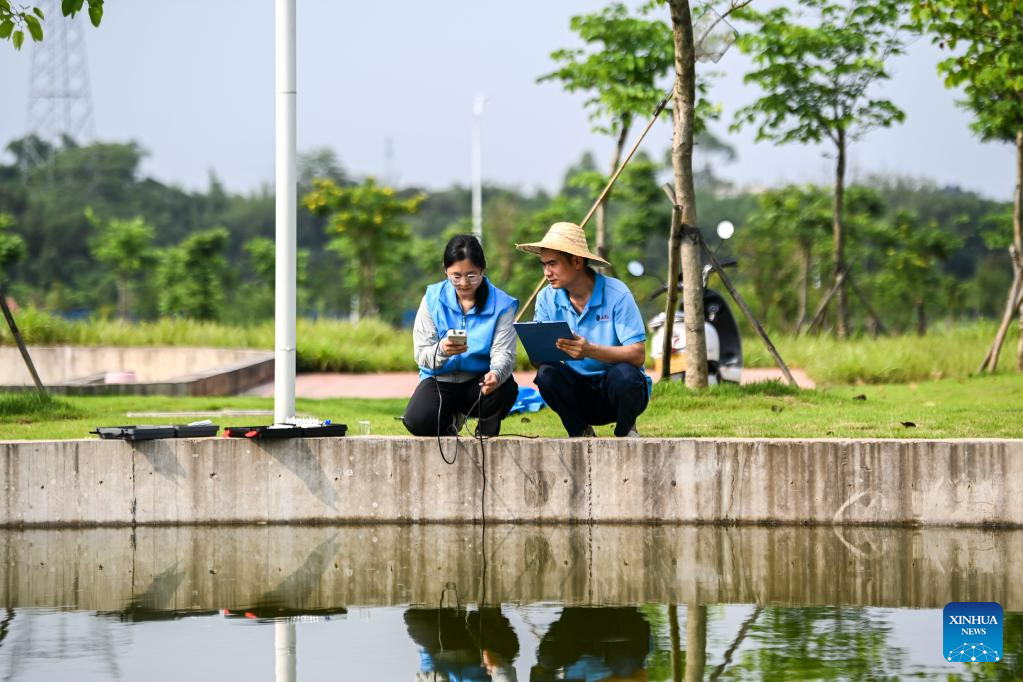 Technicians conduct water quality monitor at a fish propagation station of the Dateng Gorge water conservancy project in Guiping City, south China's Guangxi Zhuang Autonomous Region, May 20, 2023. (Xinhua/Cao Yiming)
