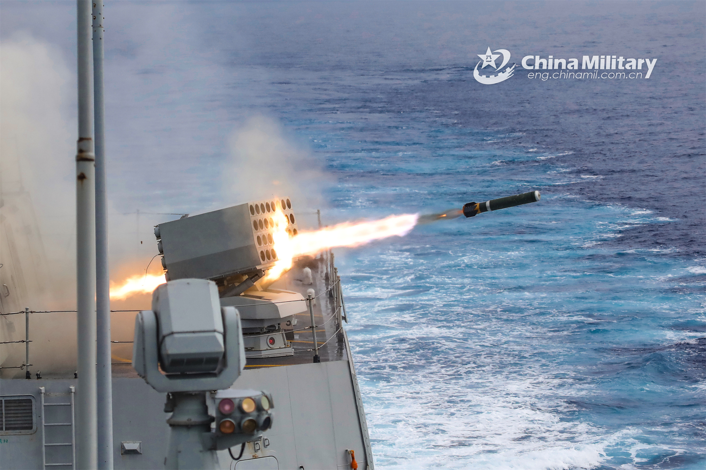 The naval guided-missile destroyer Dalian (Hull 105) attached to the PLA Southern Theater Command fires a jamming shell during a far-sea joint training drill in early April, 2023. (eng.chinamil.com.cn/Photo by Yang Yunxiang)
