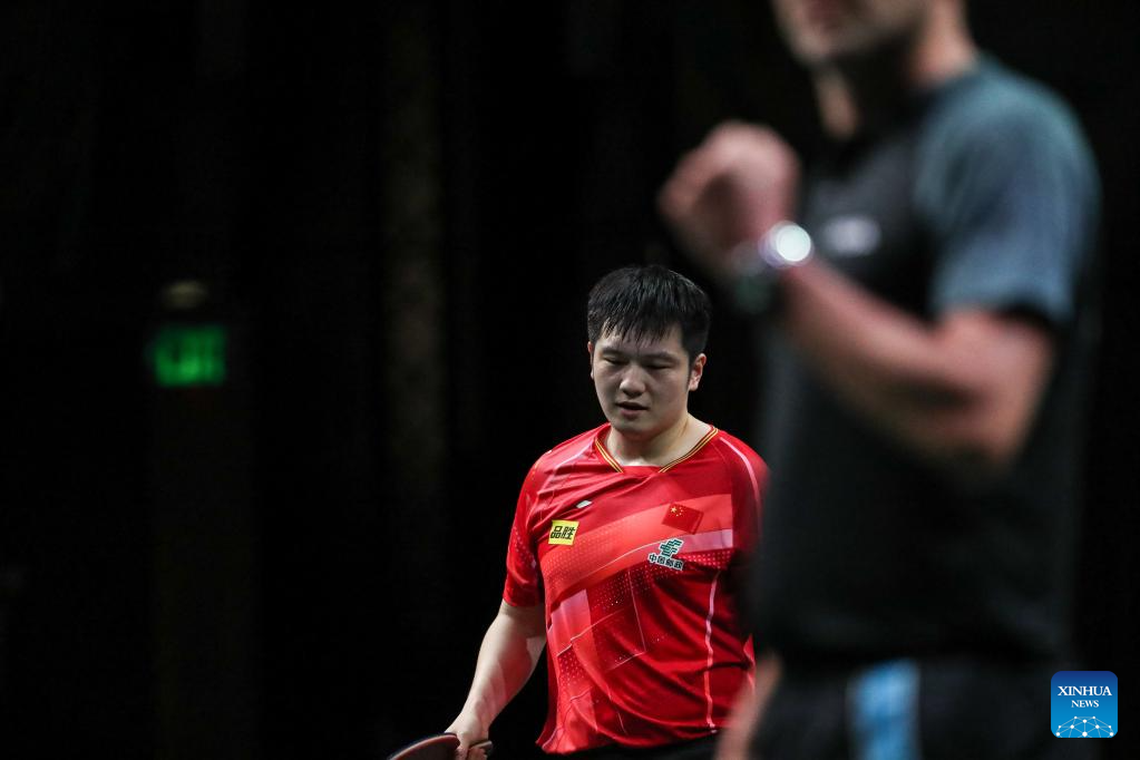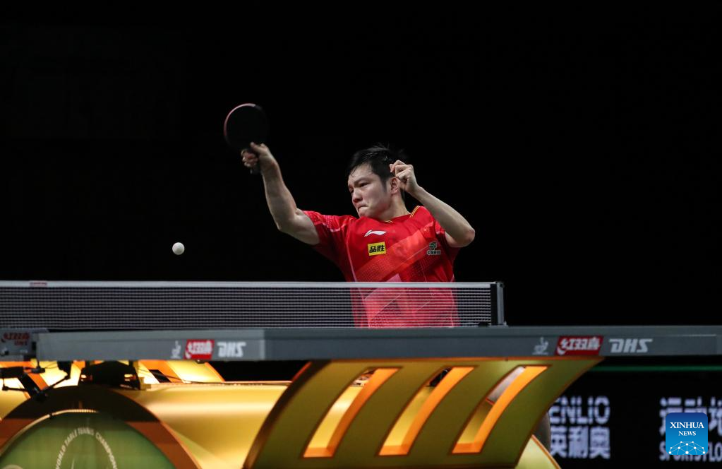 Fan Zhendong of China hits a return during the men's singles round of 64 match against Panagiotis Gionis of Greece at 2023 ITTF Table Tennis World Championships Finals in Durban, South Africa, May 22, 2023. (Xinhua/Han Xu)