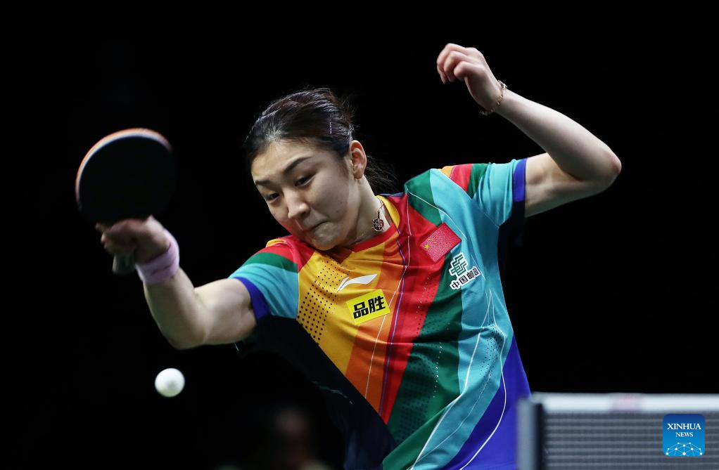 Chen Meng of China hits a return during the women's singles round of 64 match against Jinnipa Sawettabut of Thailand at 2023 ITTF Table Tennis World Championships Finals in Durban, South Africa, May 22, 2023. (Xinhua/Wang Dongzhen)