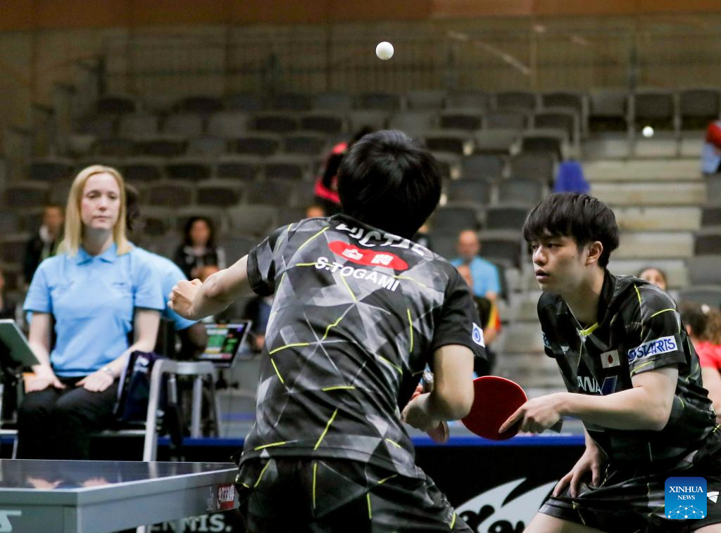 Uda Yukiya(R)/Togami Shunsuke of Japan serve during the men's doubles round of 32 match against Harmeet Desai/Manush Utpalbhai Shah of India at 2023 ITTF Table Tennis World Championships Finals in Durban, South Africa, May 22, 2023. (Xinhua/Zhang Yudong)