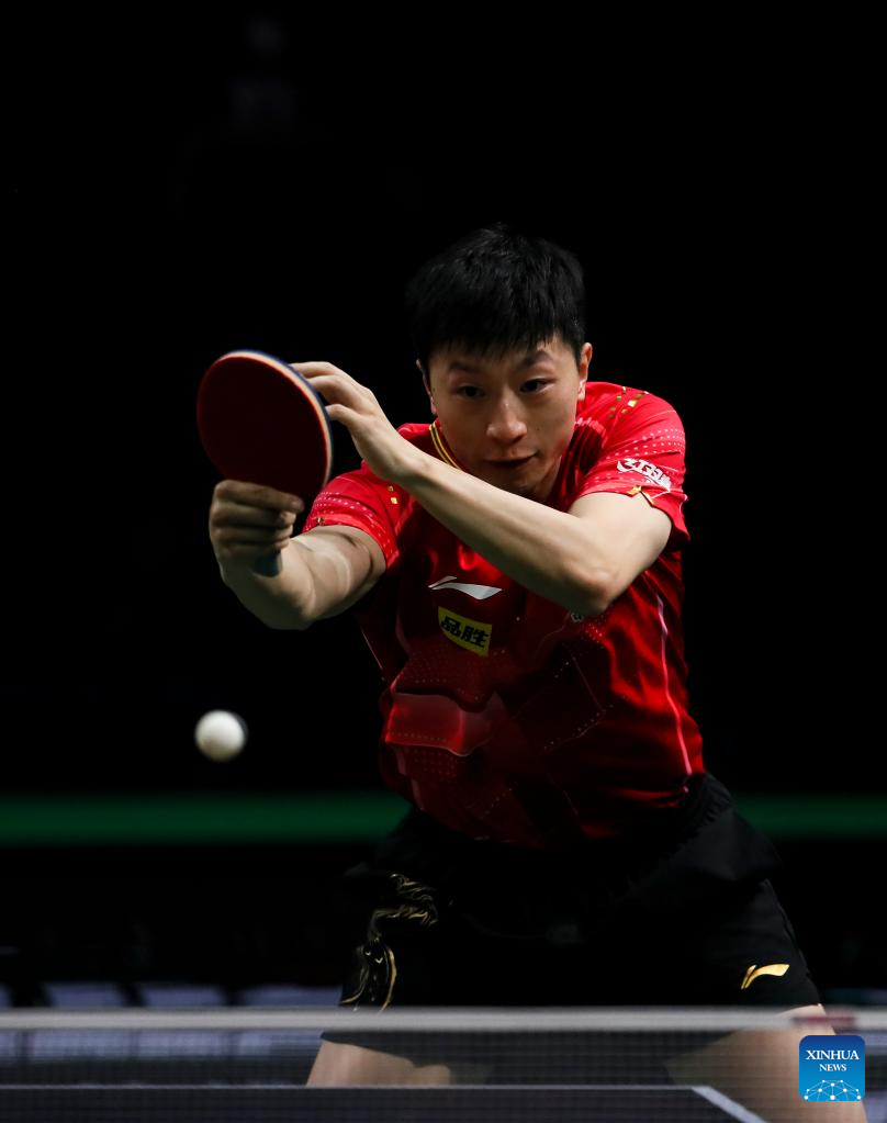 Ma Long of China hits a return during the men's singles round of 64 match against Eugene Wang of Canada at 2023 ITTF Table Tennis World Championships Finals in Durban, South Africa, May 22, 2023. (Xinhua/Zhang Yudong)