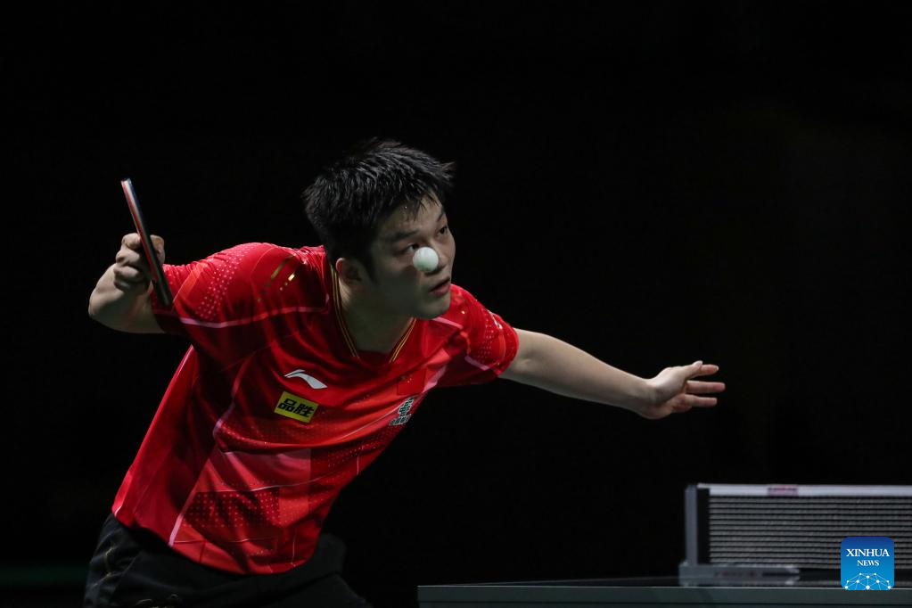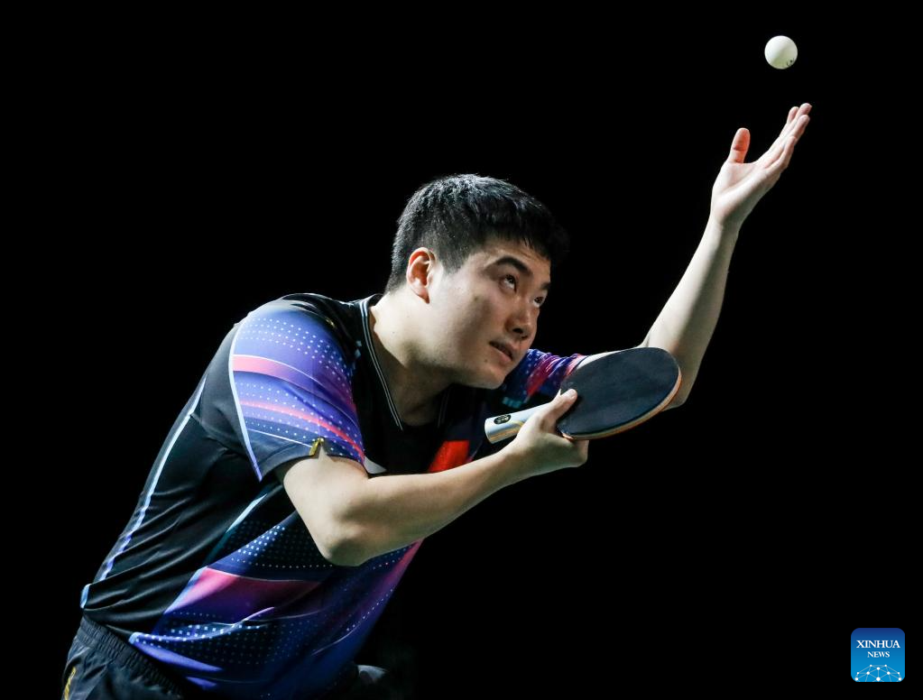Liang Jingkun of China serves during the men's singles round of 64 match against Yoshimura Maharu of Japan at 2023 ITTF Table Tennis World Championships Finals in Durban, South Africa, May 22, 2023. (Xinhua/Li Yahui)