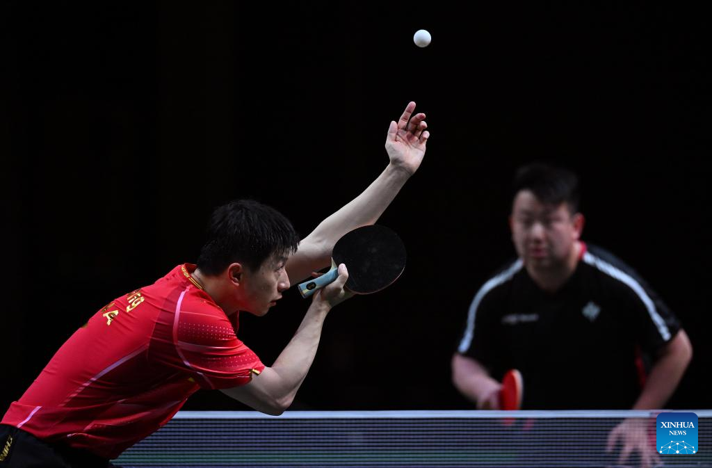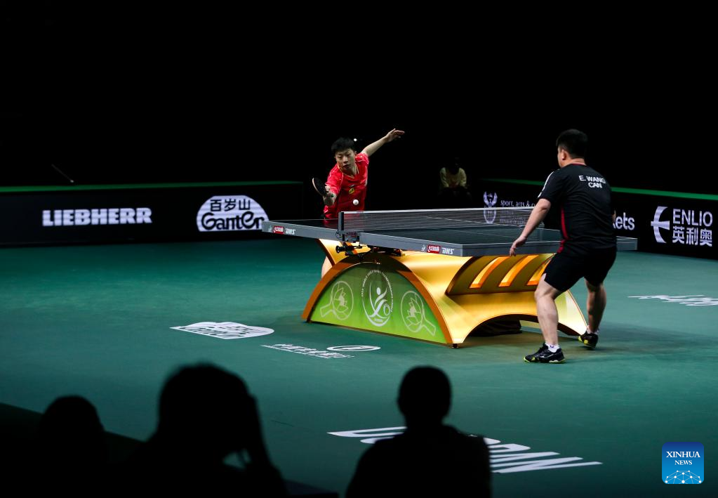 Ma Long (L) of China hits a return during the men's singles round of 64 match against Eugene Wang of Canada at 2023 ITTF Table Tennis World Championships Finals in Durban, South Africa, May 22, 2023. (Xinhua/Zhang Yudong)