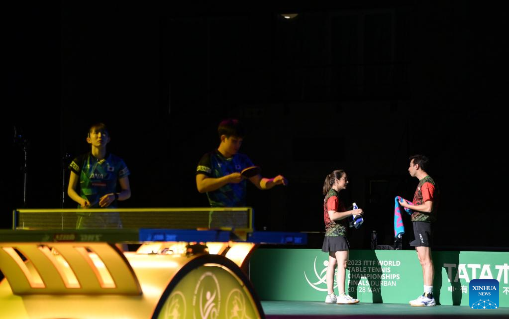 Japan's Harimoto Tomokazu/Hayata Hina(C) compete during the mixed doubles round of 32 match against Mexico's Marcos Madrid/Yadira Silva at 2023 ITTF Table Tennis World Championships Finals in Durban, South Africa, May 22, 2023. (Xinhua/Han Xu)