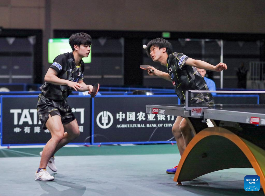 Uda Yukiya/Togami Shunsuke (R) of Japan compete during the men's doubles round of 32 match against Harmeet Desai/Manush Utpalbhai Shah of India at 2023 ITTF Table Tennis World Championships Finals in Durban, South Africa, May 22, 2023. (Xinhua/Zhang Yudong)