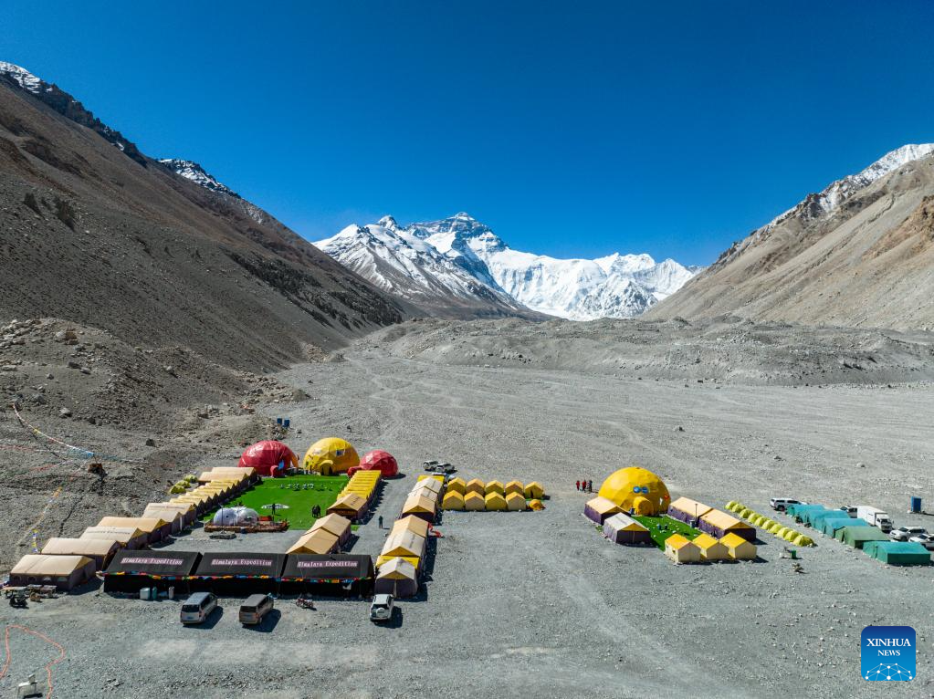 This aerial photo taken on May 9, 2023 shows the mountaineering base camp in the Qomolangma National Nature Reserve in southwest China's Tibet Autonomous Region. (Xinhua/Sun Fei)