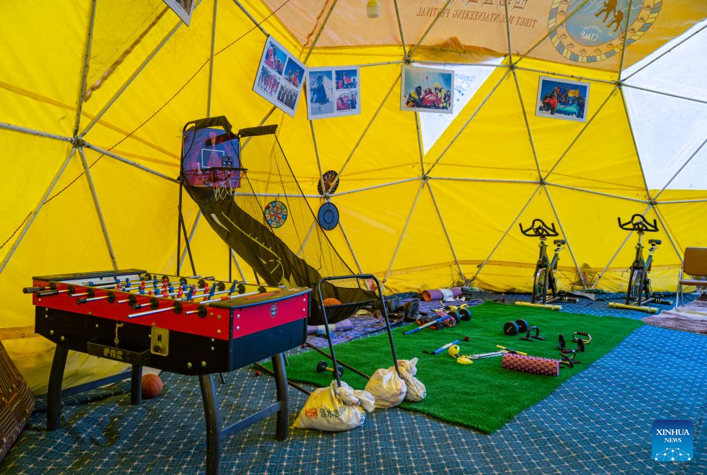 This photo taken on May 22, 2023 shows a gym inside a tent at the mountaineering base camp in the Qomolangma National Nature Reserve in southwest China's Tibet Autonomous Region. (Xinhua/Sun Fei)