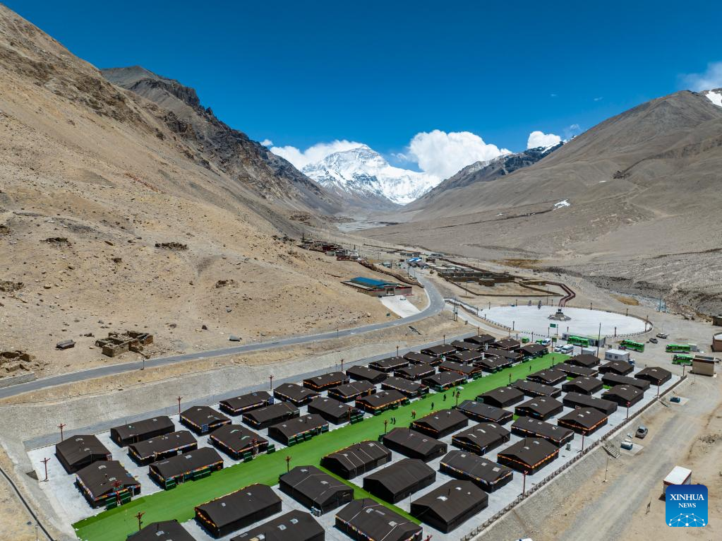 This aerial photo taken on May 20, 2023 shows the tourist base camp in the Qomolangma National Nature Reserve in southwest China's Tibet Autonomous Region. (Xinhua/Sun Fei)