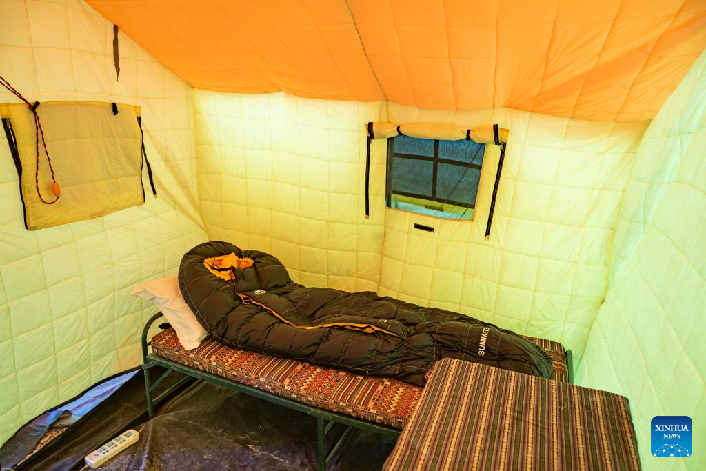 This photo taken on May 22, 2023 shows a small tent used by guides, mountaineers and expedition members for the night at the mountaineering base camp in the Qomolangma National Nature Reserve in southwest China's Tibet Autonomous Region. (Xinhua/Sun Fei)