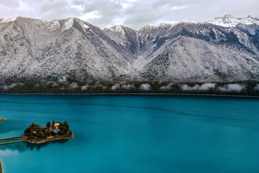 This aerial photo taken on March 19, 2023 shows the scenery of Basum Lake after snow in the city of Nyingchi, southwest China's Tibet Autonomous Region. (Xinhua/Jiang Fan)