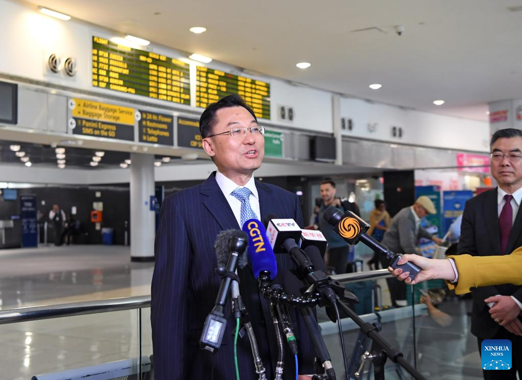 Xie Feng, China's new ambassador to the United States, delivers brief remarks to the media upon his arrival at the John F. Kennedy International Airport in New York, the United States, on May 23, 2023. Xie Feng on Tuesday urged Washington to work with China to enhance dialogue, manage difference and promote cooperation, so as to bring China-U.S. relations back to the right track. (Xinhua/Li Rui)