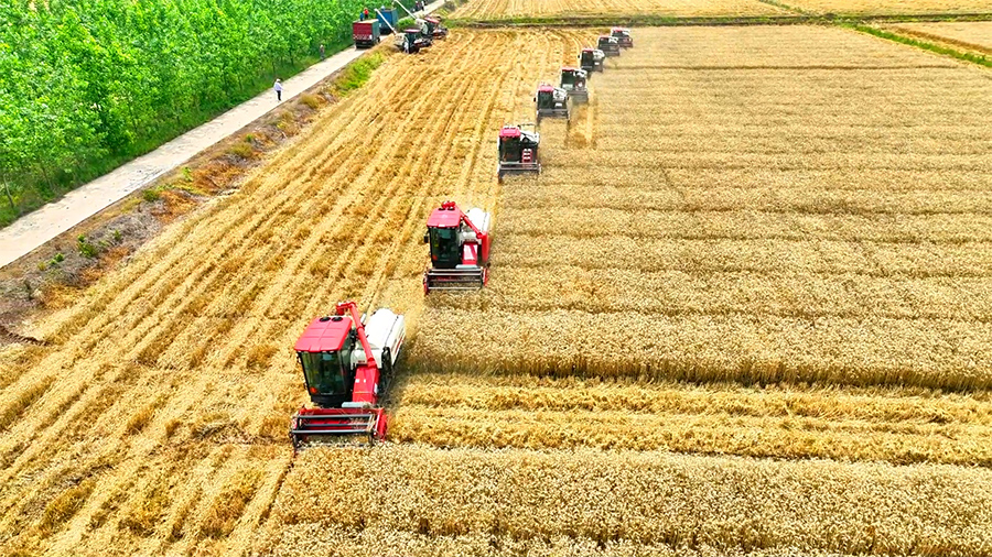 Agricultural machinery harvest winter wheat in Wangjiang county, east China's Anhui Province. (Photo/Chen Long)