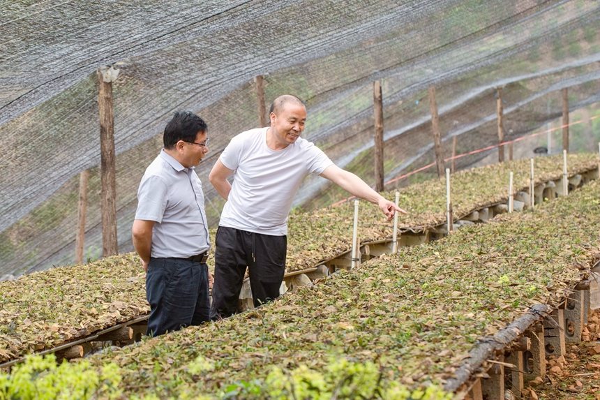 Staff members check on the growth of dendrobium catenatum at a planting base in Zhoubang village, Xilin county, Baise, southwest China's Guangxi Zhuang Autonomous Region. (Photo/Li Shihua)