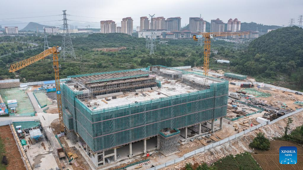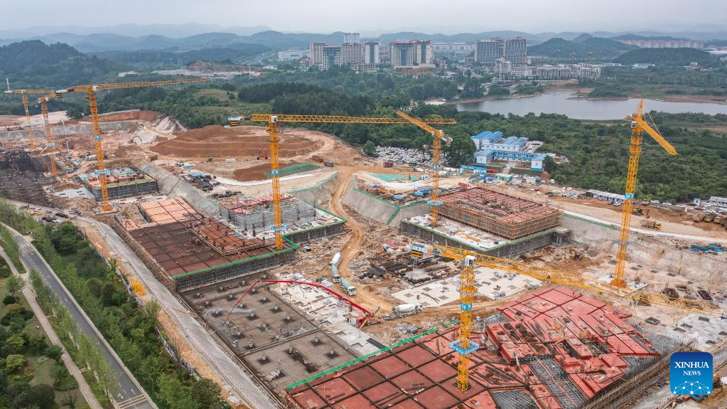 This aerial photo taken on May 23, 2023 shows the construction site of the global command center project of the "Huawei Cloud" data center in Guian New Area, southwest China's Guizhou Province. In February 2022, China started work on the project to build an integrated national big data system involving the establishment of eight national computing hubs and 10 national data center clusters. Guizhou is one of the eight hubs and construction of many data center projects are in full swing. (Xinhua/Tao Liang)