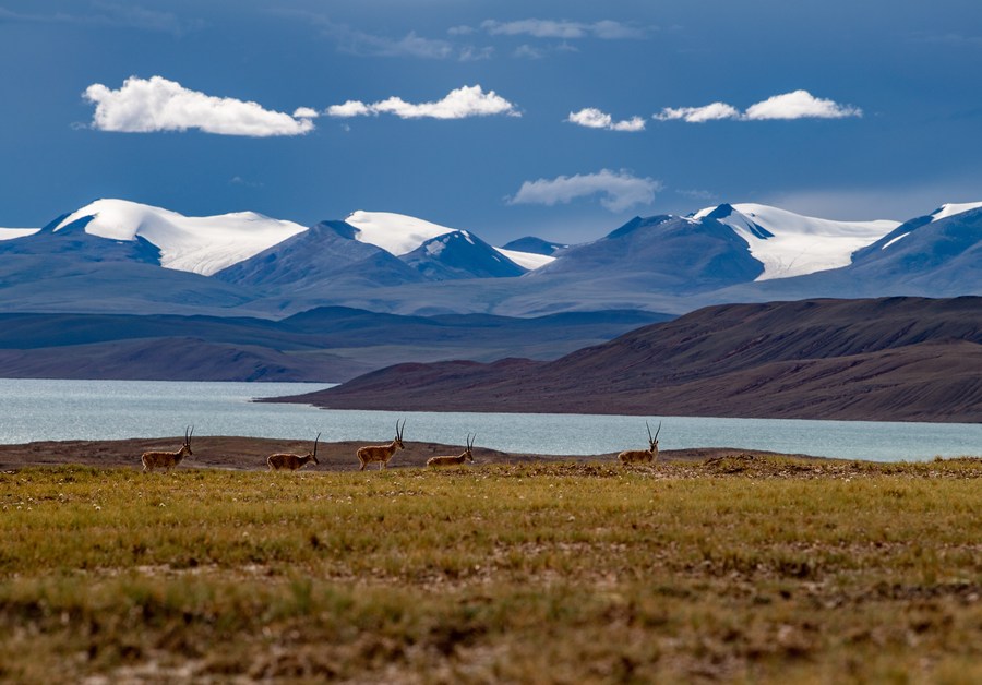Tibetan antelopes are seen in Tsonyi County of Nagqu City, southwest China's Tibet Autonomous Region, July 17, 2022. (Xinhua/Jigme Dorje)