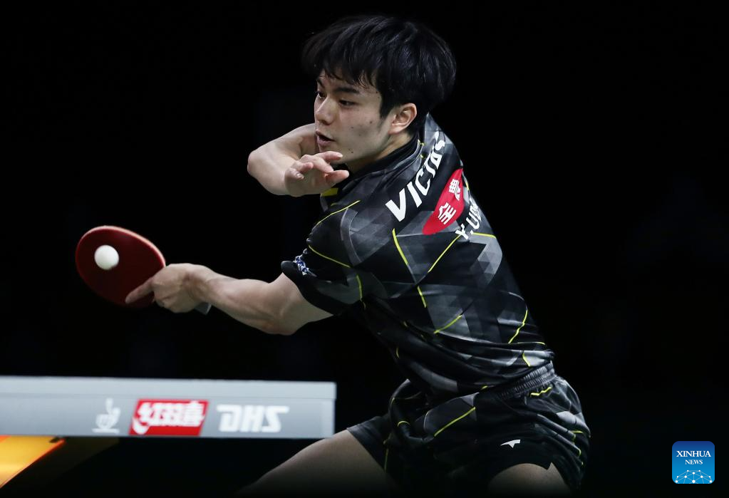 Uda Yukiya of Japan hits a return during the men's round of 32 match against Wang Chuqin of China at 2023 ITTF Table Tennis World Championships Finals in Durban, South Africa, May 24, 2023. (Xinhua/Wang Dongzhen)
