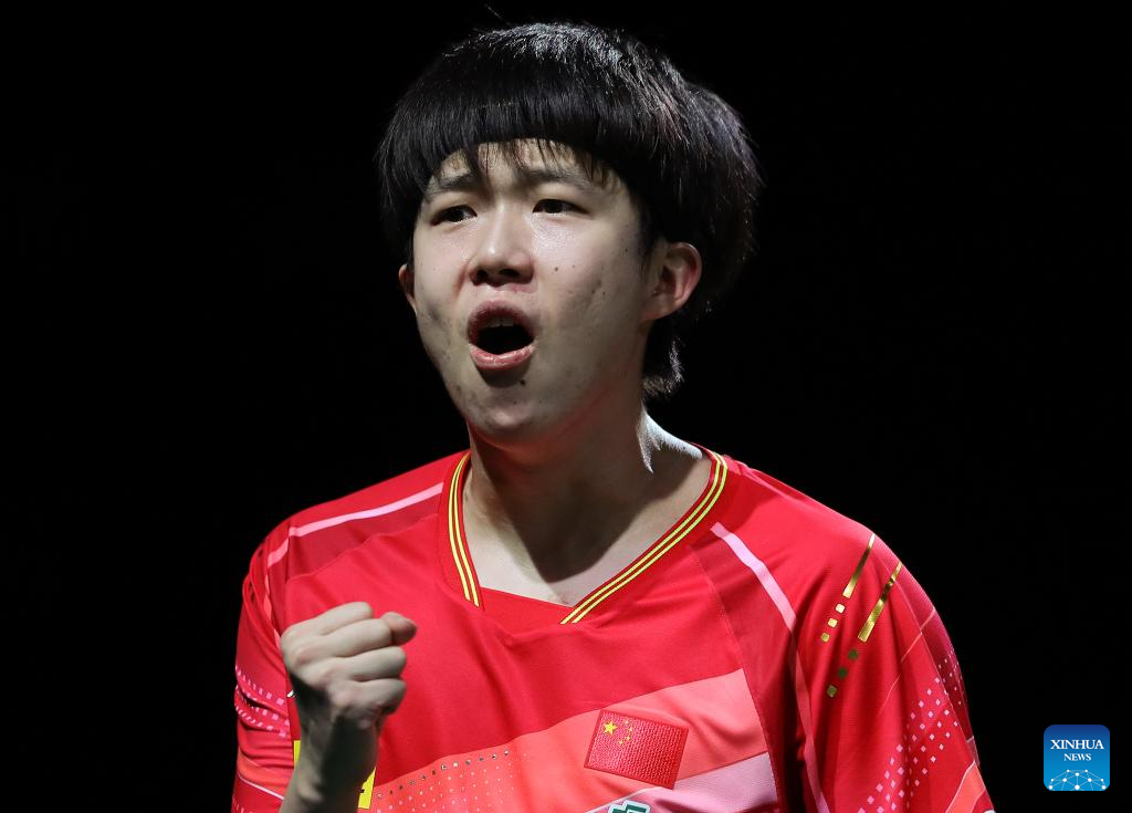 Wang Chuqin of China reacts during the men's round of 32 match against Uda Yukiya of Japan at 2023 ITTF Table Tennis World Championships Finals in Durban, South Africa, May 24, 2023. (Xinhua/Wang Dongzhen)