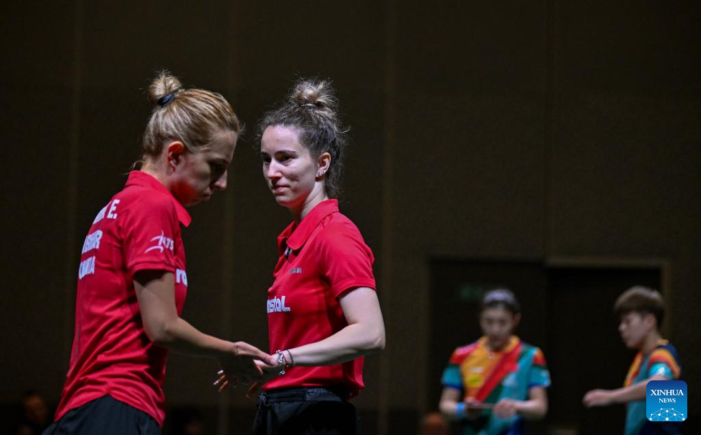 Andreea Dragoman (2nd L)/Elizabeta Samara of Romania react during the women's doubles round of 16 match against Chen Meng/Wang Yidi of China at 2023 ITTF Table Tennis World Championships Finals in Durban, South Africa, May 24, 2023. (Xinhua/Tao Xiyi)