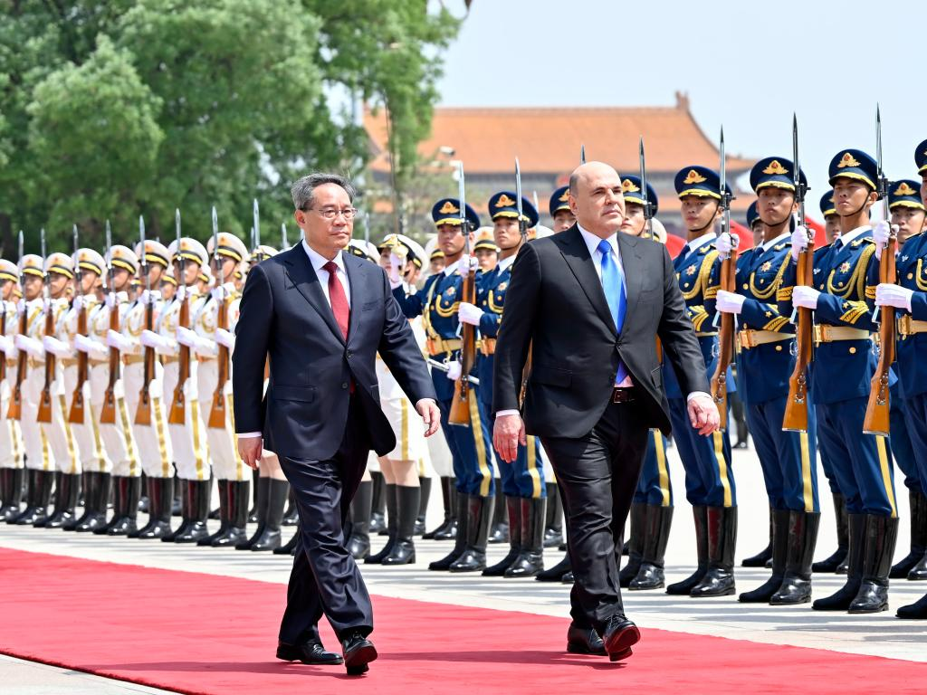 Chinese Premier Li Qiang holds a welcoming ceremony for Prime Minister of the Russian Federation Mikhail Mishustin prior to their talks at the square outside the east entrance of the Great Hall of the People in Beijing, capital of China, May 24, 2023. Li held talks with Mishustin on Wednesday in Beijing. (Xinhua/Yin Bogu)