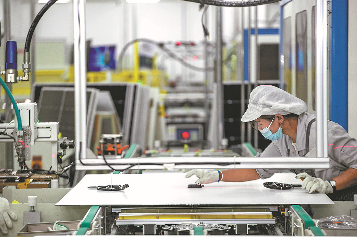 An employee works at a PV panel production line in Taizhou, Jiangsu province, in December. TANG DEHONG/FOR CHINA DAILY