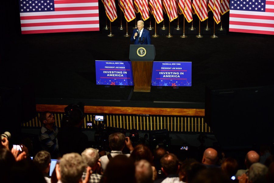 U.S. President Joe Biden speaks at SUNY Westchester Community College in Valhalla, New York, the United States, on May 10, 2023. Speaking at SUNY Westchester Community College in New York on Wednesday, Biden said the U.S. economy would fall into recession with 8 million Americans losing their jobs, and its international reputation would be damaged in the extreme in the case of a debt default. (Photo by Mykyta Starychenko/Xinhua)