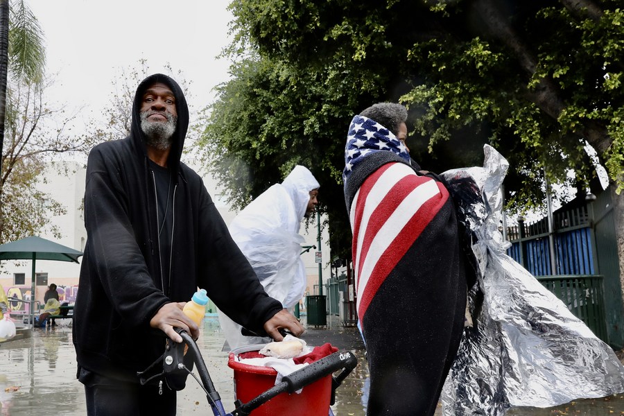 Homeless people stand in the rain in the Skid Row Park in downtown Los Angeles, California, the United States, on Jan. 10, 2023. (Xinhua)